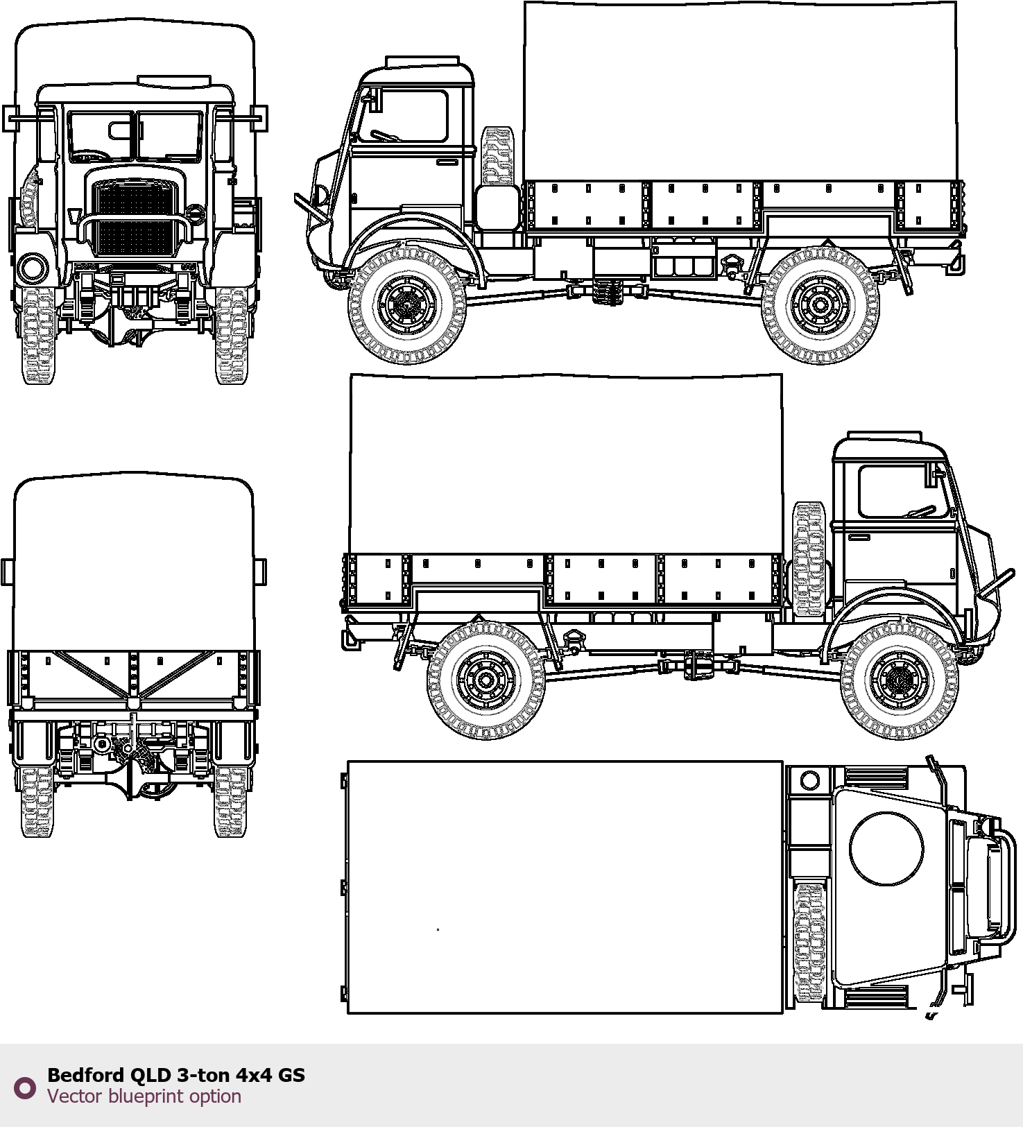 Raster blueprint of the Bedford QLD 3-ton 4x4 GS Heavy Truck. This free downloadable image can be used for graphic projects, digital design, and 3D modeling. The file provides accurate exterior proportions of the vehicle. Body type: Heavy Truck.