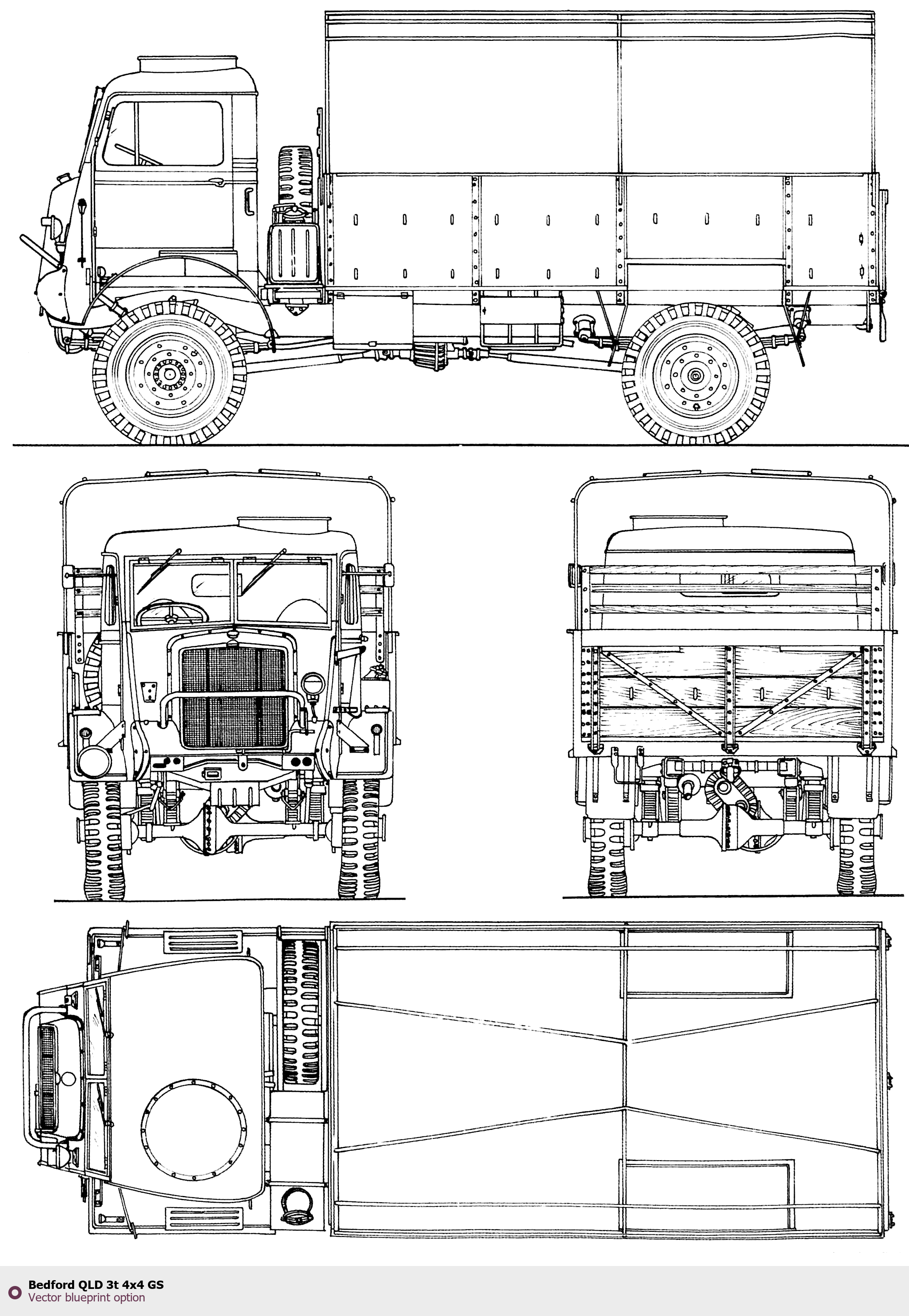 Raster blueprint of the Bedford QLD 3t 4x4 GS Heavy Truck. This free downloadable image can be used for graphic projects, digital design, and 3D modeling. The file provides accurate exterior proportions of the vehicle. Body type: Heavy Truck.