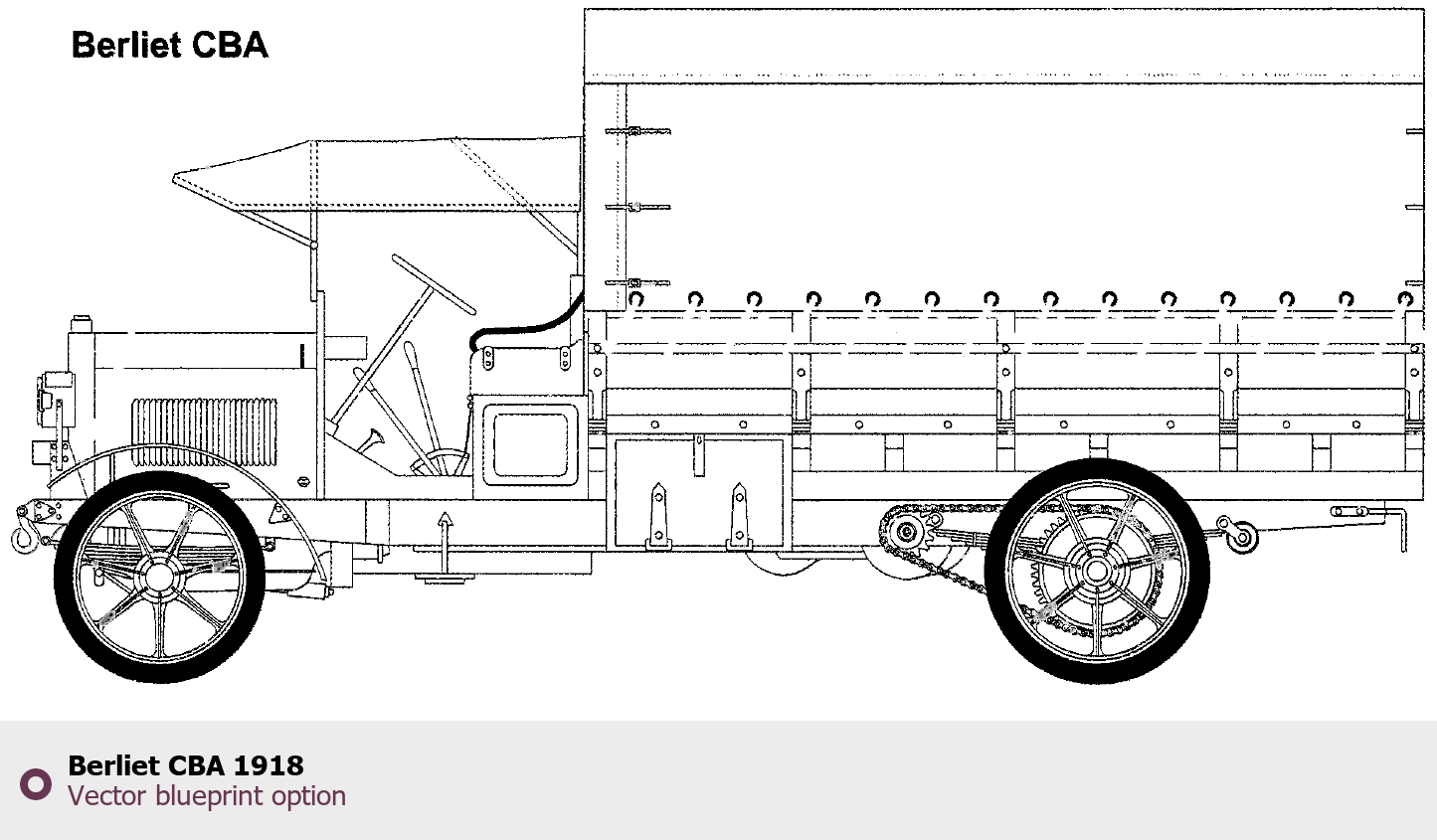 Raster blueprint of the 1918 Berliet CBA Heavy Truck. This free downloadable image can be used for graphic projects, digital design, and 3D modeling. The file provides accurate exterior proportions of the vehicle. Model year: 1918. Body type: Heavy Truck.