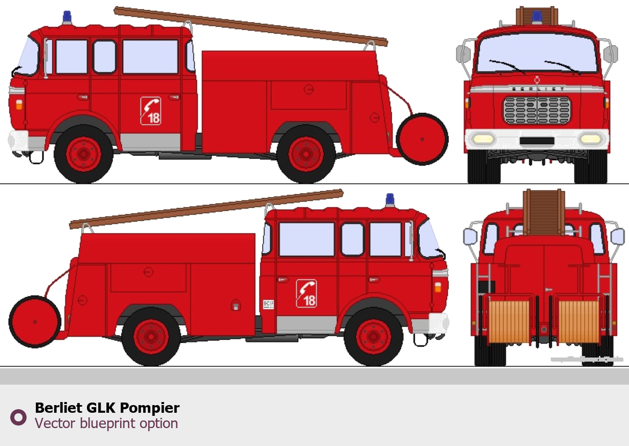 Raster blueprint of the Berliet GLK Pompier Heavy Truck. This free downloadable image can be used for graphic projects, digital design, and 3D modeling. The file provides accurate exterior proportions of the vehicle. Body type: Heavy Truck.