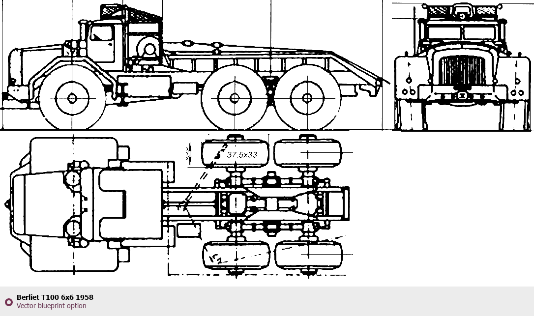 Raster blueprint of the 1958 Berliet T100 6x6 Heavy Truck. This free downloadable image can be used for graphic projects, digital design, and 3D modeling. The file provides accurate exterior proportions of the vehicle. Model year: 1958. Body type: Heavy Truck.