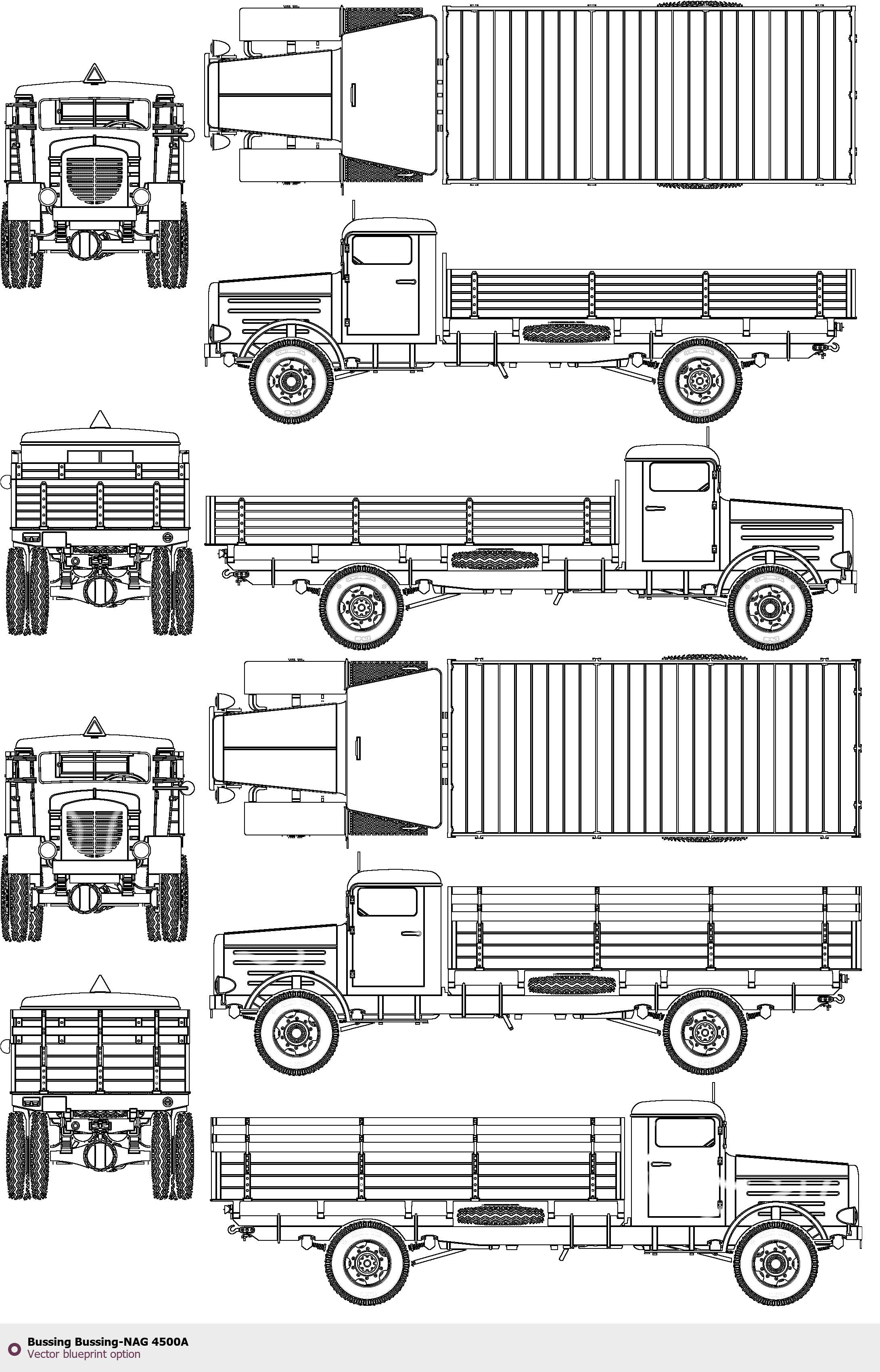 Raster blueprint of the Bussing Bussing-NAG 4500A Heavy Truck. This free downloadable image can be used for graphic projects, digital design, and 3D modeling. The file provides accurate exterior proportions of the vehicle. Body type: Heavy Truck.