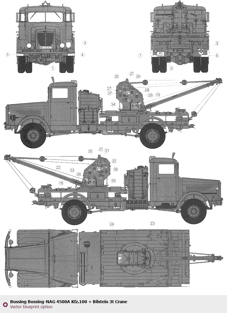 Raster blueprint of the Bussing Bussing-NAG 4500A Kfz.100 + Bilstein 3t Crane Heavy Truck. This free downloadable image can be used for graphic projects, digital design, and 3D modeling. The file provides accurate exterior proportions of the vehicle. Body type: Heavy Truck.