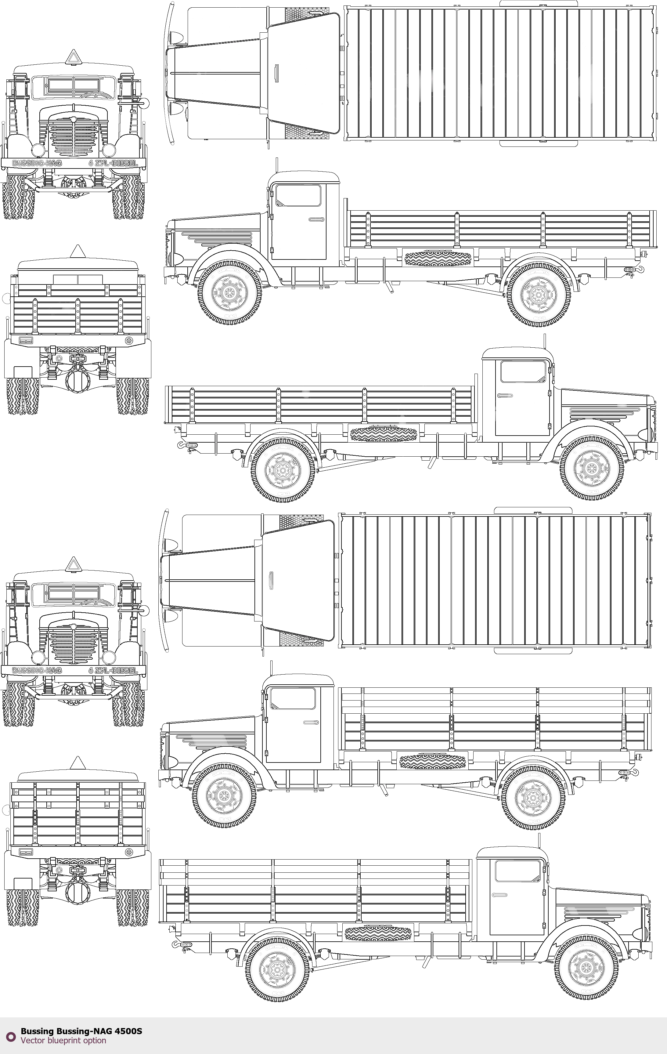 Raster blueprint of the Bussing Bussing-NAG 4500S Heavy Truck. This free downloadable image can be used for graphic projects, digital design, and 3D modeling. The file provides accurate exterior proportions of the vehicle. Body type: Heavy Truck.