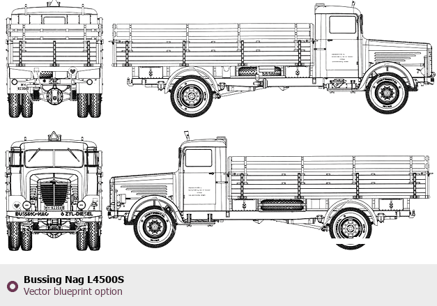 Raster blueprint of the Bussing Nag L4500S Heavy Truck. This free downloadable image can be used for graphic projects, digital design, and 3D modeling. The file provides accurate exterior proportions of the vehicle. Body type: Heavy Truck.