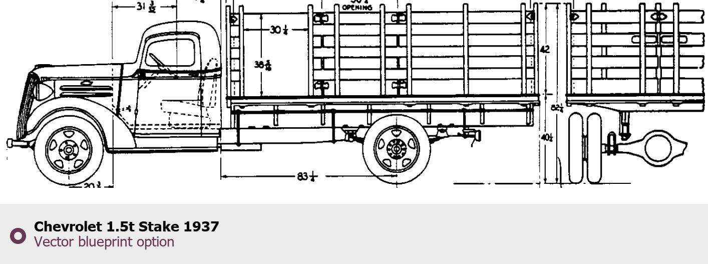 Raster blueprint of the 1937 Chevrolet 1.5t Stake Heavy Truck. This free downloadable image can be used for graphic projects, digital design, and 3D modeling. The file provides accurate exterior proportions of the vehicle. Model year: 1937. Body type: Heavy Truck.