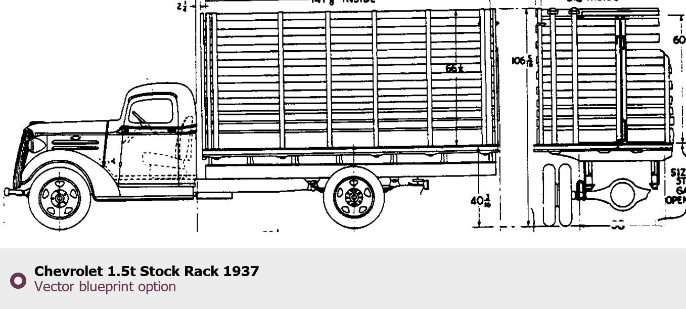 Raster blueprint of the 1937 Chevrolet 1.5t Stock Rack Heavy Truck. This free downloadable image can be used for graphic projects, digital design, and 3D modeling. The file provides accurate exterior proportions of the vehicle. Model year: 1937. Body type: Heavy Truck.