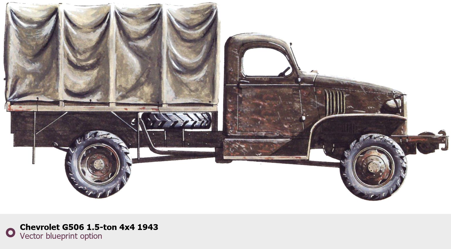 Raster blueprint of the Chevrolet G506 1.5-ton 4x4 1943 Heavy Truck. This free downloadable image can be used for graphic projects, digital design, and 3D modeling. The file provides accurate exterior proportions of the vehicle. Body type: Heavy Truck.