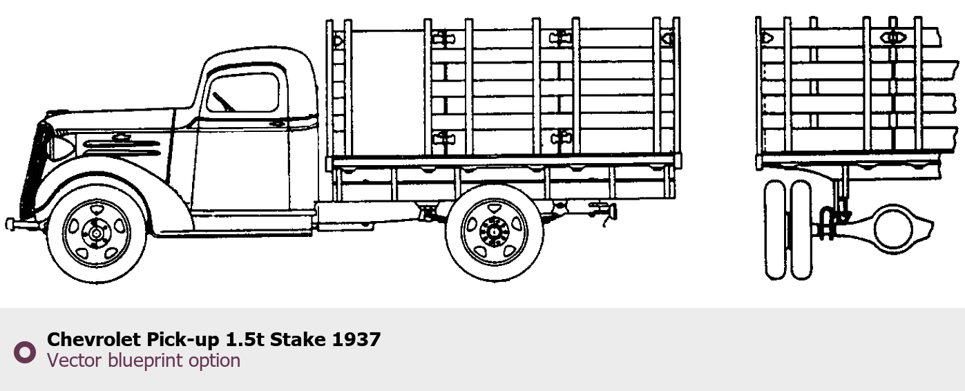 Raster blueprint of the 1937 Chevrolet Pick-up 1.5t Stake Pickup Truck. This free downloadable image can be used for graphic projects, digital design, and 3D modeling. The file provides accurate exterior proportions of the vehicle. Model year: 1937. Body type: Pickup Truck.