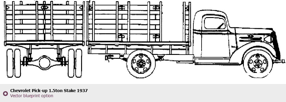Raster blueprint of the 1937 Chevrolet Pick-up 1.5ton Stake Pickup Truck. This free downloadable image can be used for graphic projects, digital design, and 3D modeling. The file provides accurate exterior proportions of the vehicle. Model year: 1937. Body type: Pickup Truck.