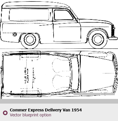 Raster blueprint of the 1954 Commer Express Delivery Van Van. This free downloadable image can be used for graphic projects, digital design, and 3D modeling. The file provides accurate exterior proportions of the vehicle. Model year: 1954. Body type: Van.