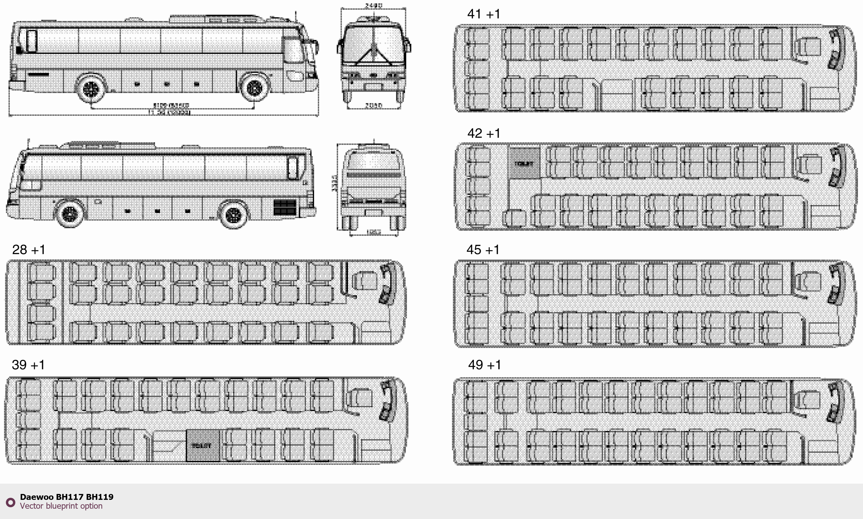 Raster blueprint of the Daewoo BH117 BH119 Bus. This free downloadable image can be used for graphic projects, digital design, and 3D modeling. The file provides accurate exterior proportions of the vehicle. Body type: Bus.