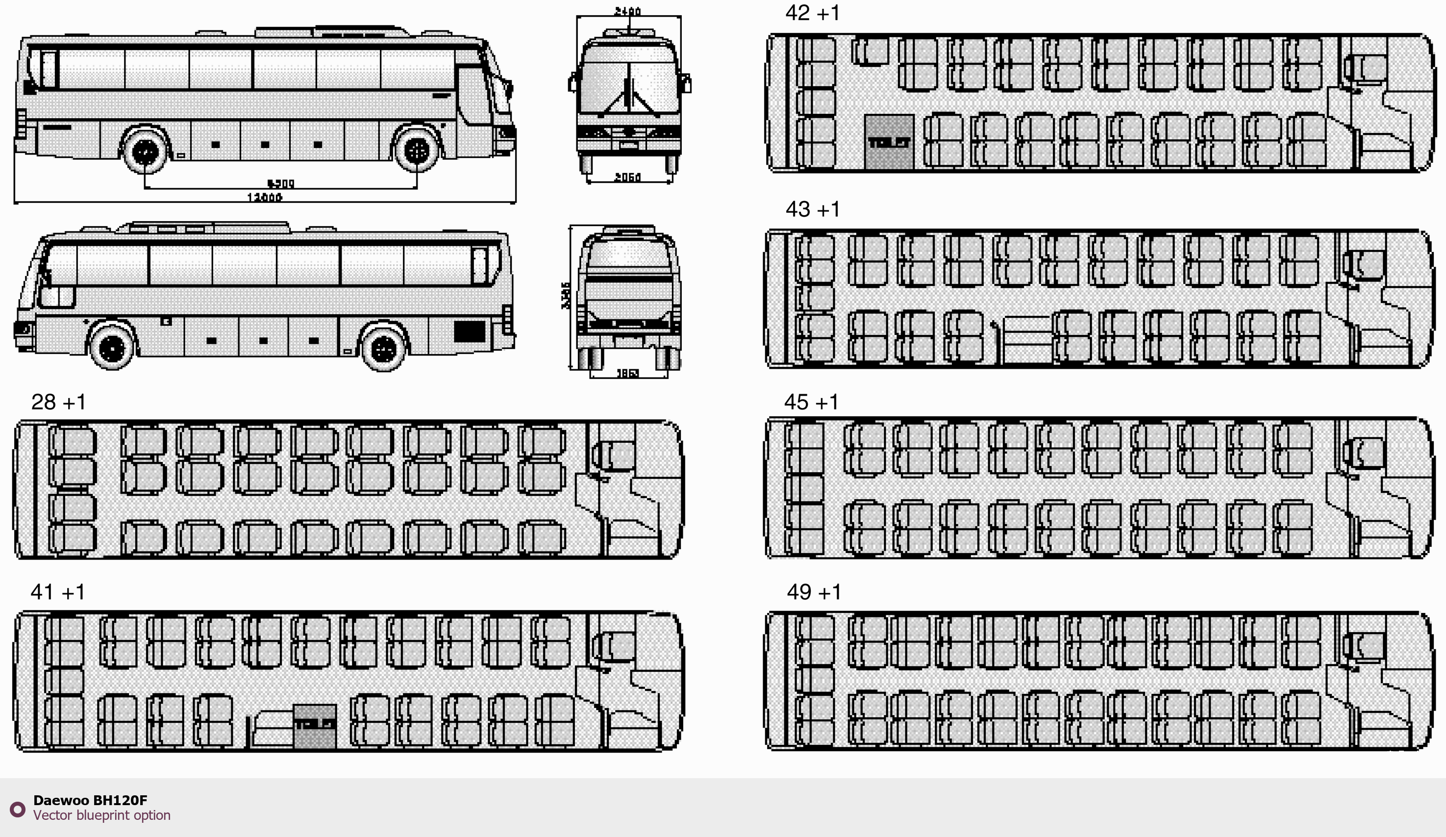 Raster blueprint of the Daewoo BH120F Bus. This free downloadable image can be used for graphic projects, digital design, and 3D modeling. The file provides accurate exterior proportions of the vehicle. Body type: Bus.