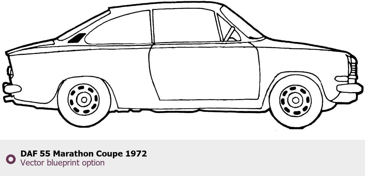 Raster blueprint of the 1972 DAF 55 Marathon Coupe Coupe. This free downloadable image can be used for graphic projects, digital design, and 3D modeling. The file provides accurate exterior proportions of the vehicle. Model year: 1972. Body type: Coupe.