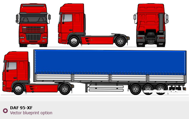 Raster blueprint of the DAF 95-XF Heavy Truck. This free downloadable image can be used for graphic projects, digital design, and 3D modeling. The file provides accurate exterior proportions of the vehicle. Body type: Heavy Truck.