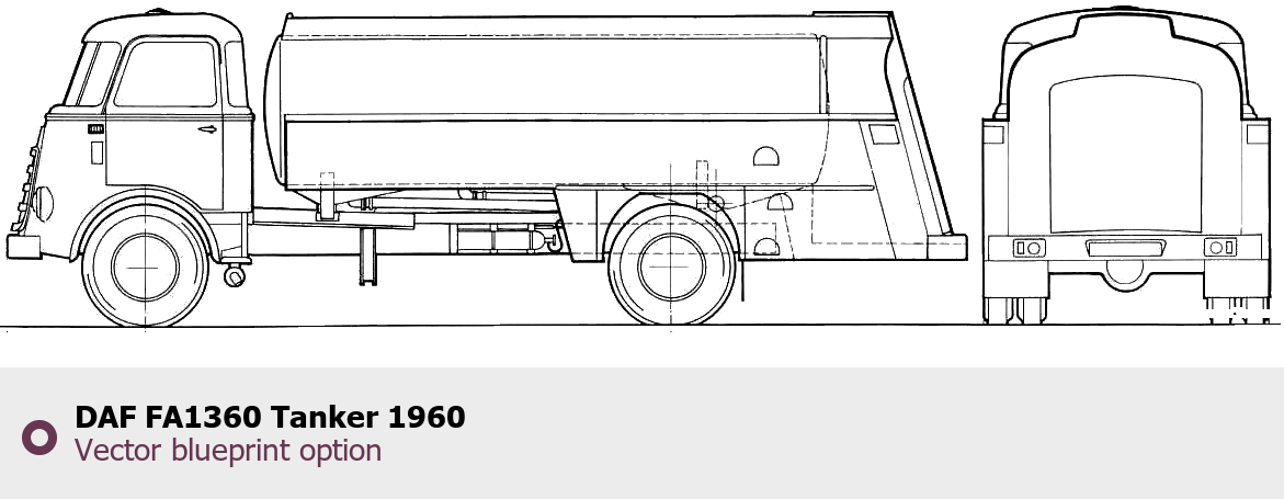 Raster blueprint of the 1960 DAF FA1360 Tanker Heavy Truck. This free downloadable image can be used for graphic projects, digital design, and 3D modeling. The file provides accurate exterior proportions of the vehicle. Model year: 1960. Body type: Heavy Truck.