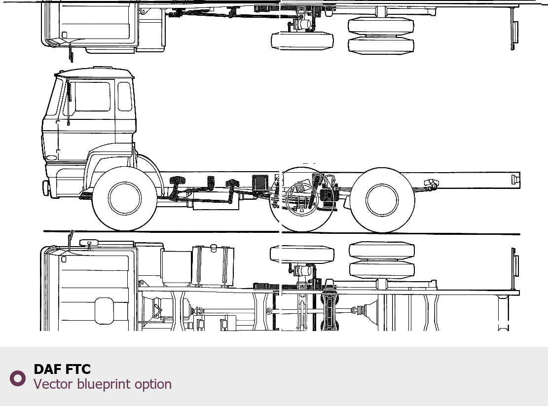 Raster blueprint of the DAF FTC Heavy Truck. This free downloadable image can be used for graphic projects, digital design, and 3D modeling. The file provides accurate exterior proportions of the vehicle. Body type: Heavy Truck.