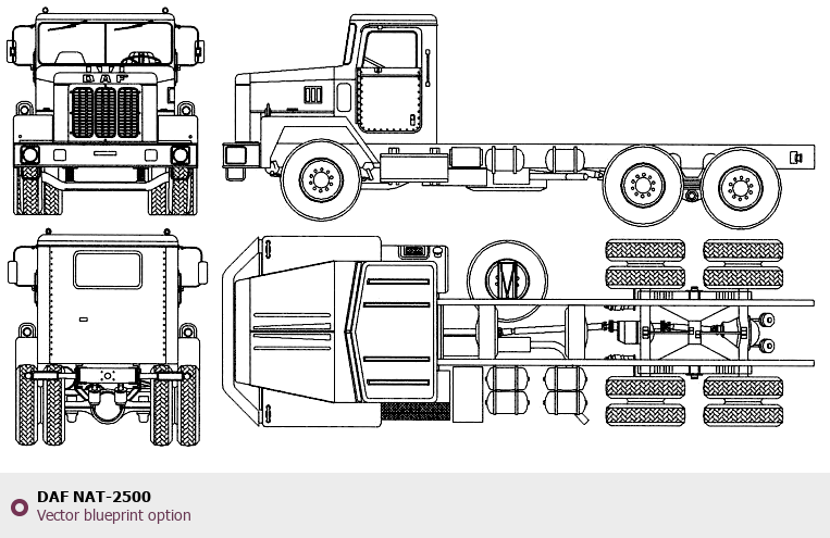 Raster blueprint of the DAF NAT-2500 Heavy Truck. This free downloadable image can be used for graphic projects, digital design, and 3D modeling. The file provides accurate exterior proportions of the vehicle. Body type: Heavy Truck.