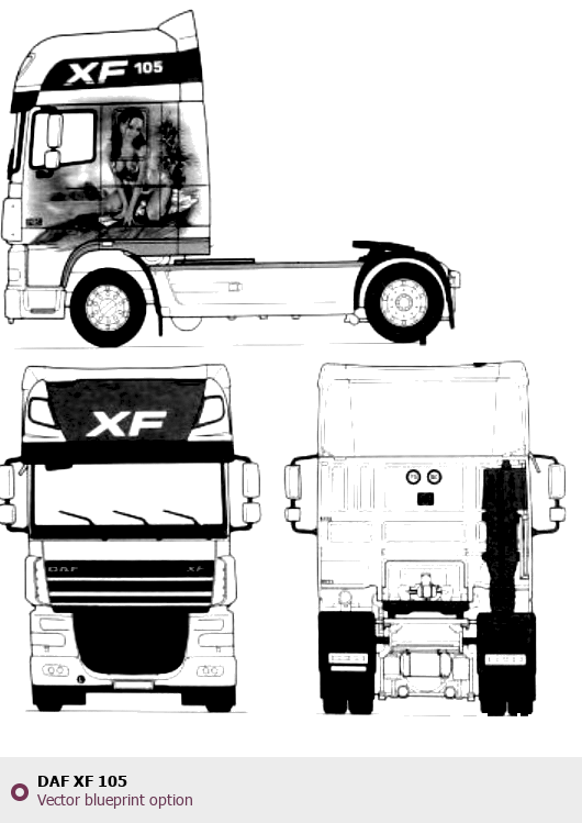 Raster blueprint of the DAF XF 105 Heavy Truck. This free downloadable image can be used for graphic projects, digital design, and 3D modeling. The file provides accurate exterior proportions of the vehicle. Body type: Heavy Truck.