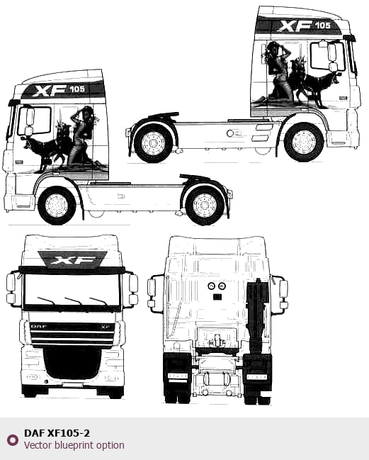 Raster blueprint of the DAF XF105-2 Heavy Truck. This free downloadable image can be used for graphic projects, digital design, and 3D modeling. The file provides accurate exterior proportions of the vehicle. Body type: Heavy Truck.
