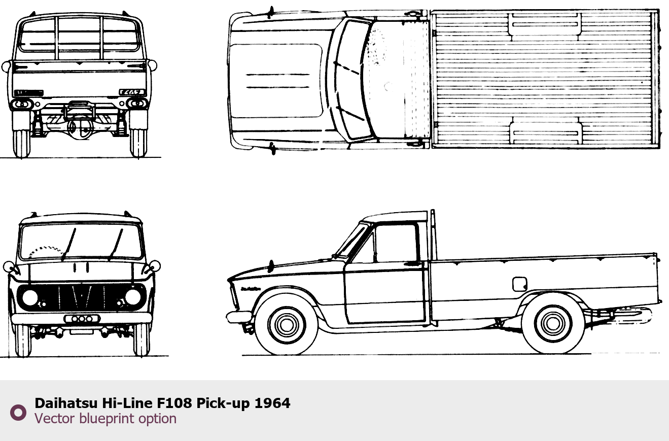 Raster blueprint of the 1964 Daihatsu Hi-Line F108 Pick-up Pickup Truck. This free downloadable image can be used for graphic projects, digital design, and 3D modeling. The file provides accurate exterior proportions of the vehicle. Model year: 1964. Body type: Pickup Truck.