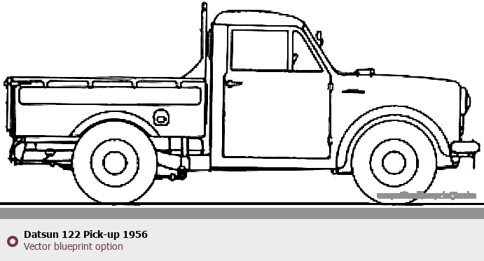 Raster blueprint of the 1956 Datsun 122 Pick-up Pickup Truck. This free downloadable image can be used for graphic projects, digital design, and 3D modeling. The file provides accurate exterior proportions of the vehicle. Model year: 1956. Body type: Pickup Truck.