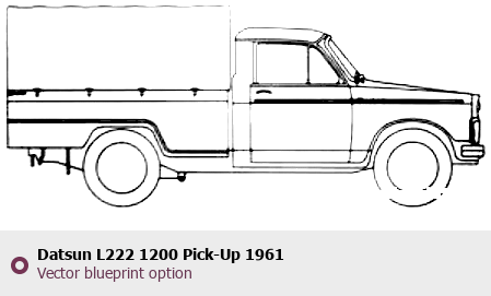 Raster blueprint of the 1961 Datsun L222 1200 Pick-Up Pickup Truck. This free downloadable image can be used for graphic projects, digital design, and 3D modeling. The file provides accurate exterior proportions of the vehicle. Model year: 1961. Body type: Pickup Truck.