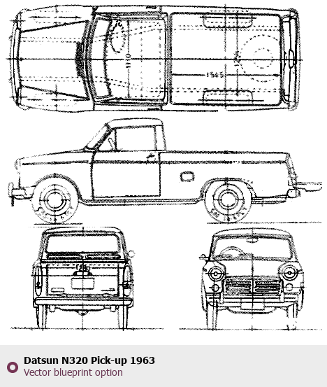 Raster blueprint of the 1963 Datsun N320 Pick-up Pickup Truck. This free downloadable image can be used for graphic projects, digital design, and 3D modeling. The file provides accurate exterior proportions of the vehicle. Model year: 1963. Body type: Pickup Truck.