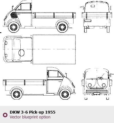 Raster blueprint of the 1955 DKW 3-6 Pick-up Pickup Truck. This free downloadable image can be used for graphic projects, digital design, and 3D modeling. The file provides accurate exterior proportions of the vehicle. Model year: 1955. Body type: Pickup Truck.