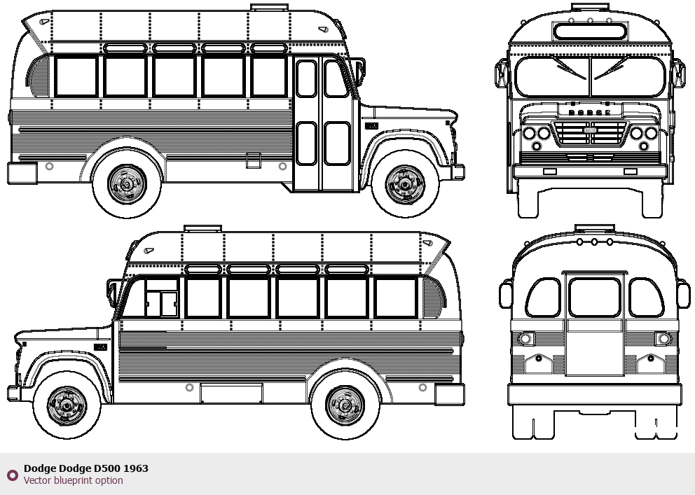 Raster blueprint of the 1963 Dodge D500 Bus. This free downloadable image can be used for graphic projects, digital design, and 3D modeling. The file provides accurate exterior proportions of the vehicle. Model year: 1963. Body type: Bus.