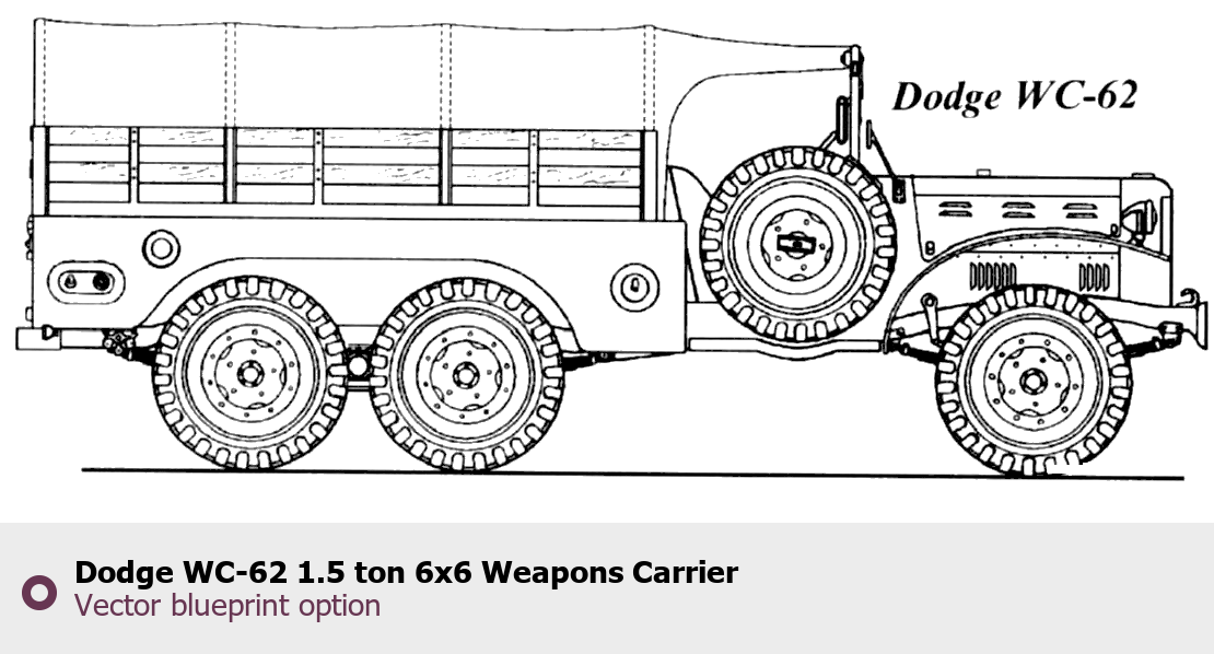 Raster blueprint of the Dodge WC-62 1.5 ton 6x6 Weapons Carrier Heavy Truck. This free downloadable image can be used for graphic projects, digital design, and 3D modeling. The file provides accurate exterior proportions of the vehicle. Body type: Heavy Truck.