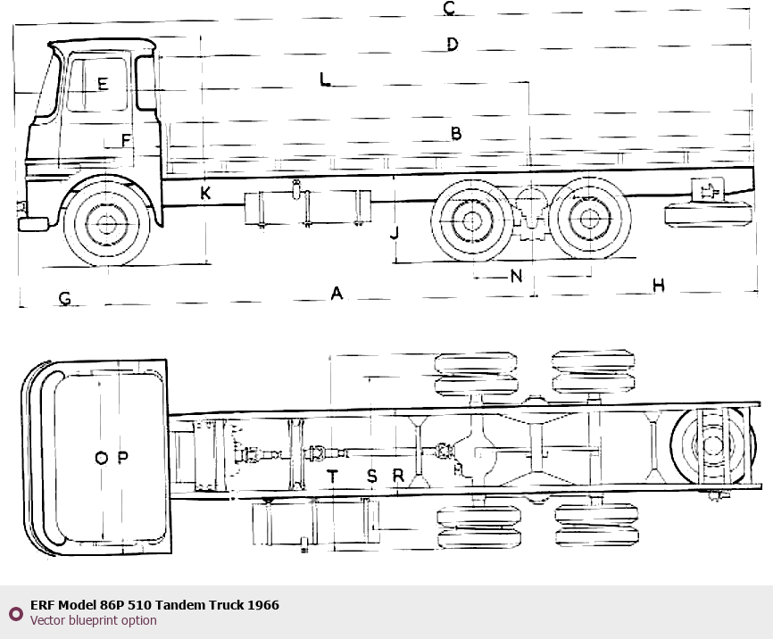 Raster blueprint of the 1966 ERF Model 86P 510 Tandem Truck Heavy Truck. This free downloadable image can be used for graphic projects, digital design, and 3D modeling. The file provides accurate exterior proportions of the vehicle. Model year: 1966. Body type: Heavy Truck.