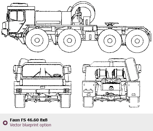 Raster blueprint of the Faun FS 46.60 8x8 Heavy Truck. This free downloadable image can be used for graphic projects, digital design, and 3D modeling. The file provides accurate exterior proportions of the vehicle. Body type: Heavy Truck.