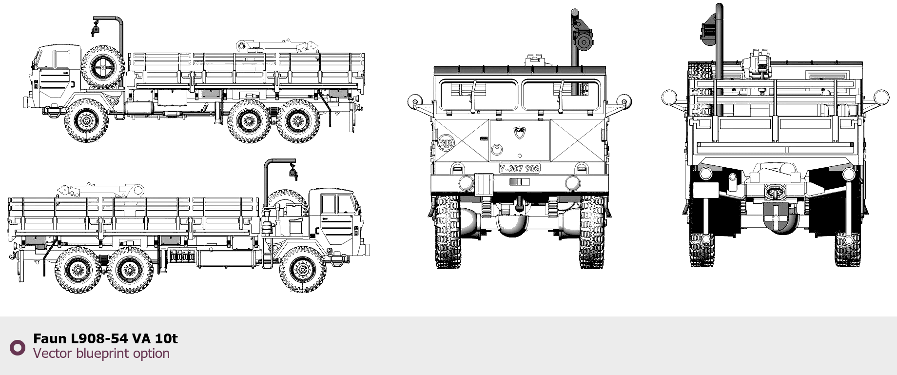 Raster blueprint of the Faun L908-54 VA 10t Heavy Truck. This free downloadable image can be used for graphic projects, digital design, and 3D modeling. The file provides accurate exterior proportions of the vehicle. Body type: Heavy Truck.