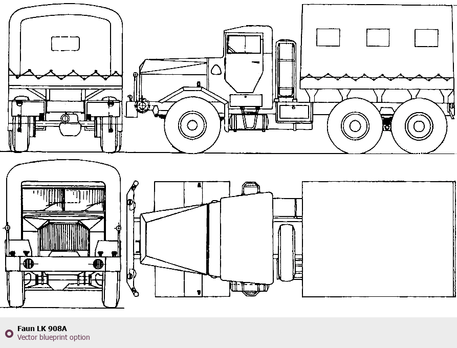 Raster blueprint of the Faun LK 908A Heavy Truck. This free downloadable image can be used for graphic projects, digital design, and 3D modeling. The file provides accurate exterior proportions of the vehicle. Body type: Heavy Truck.