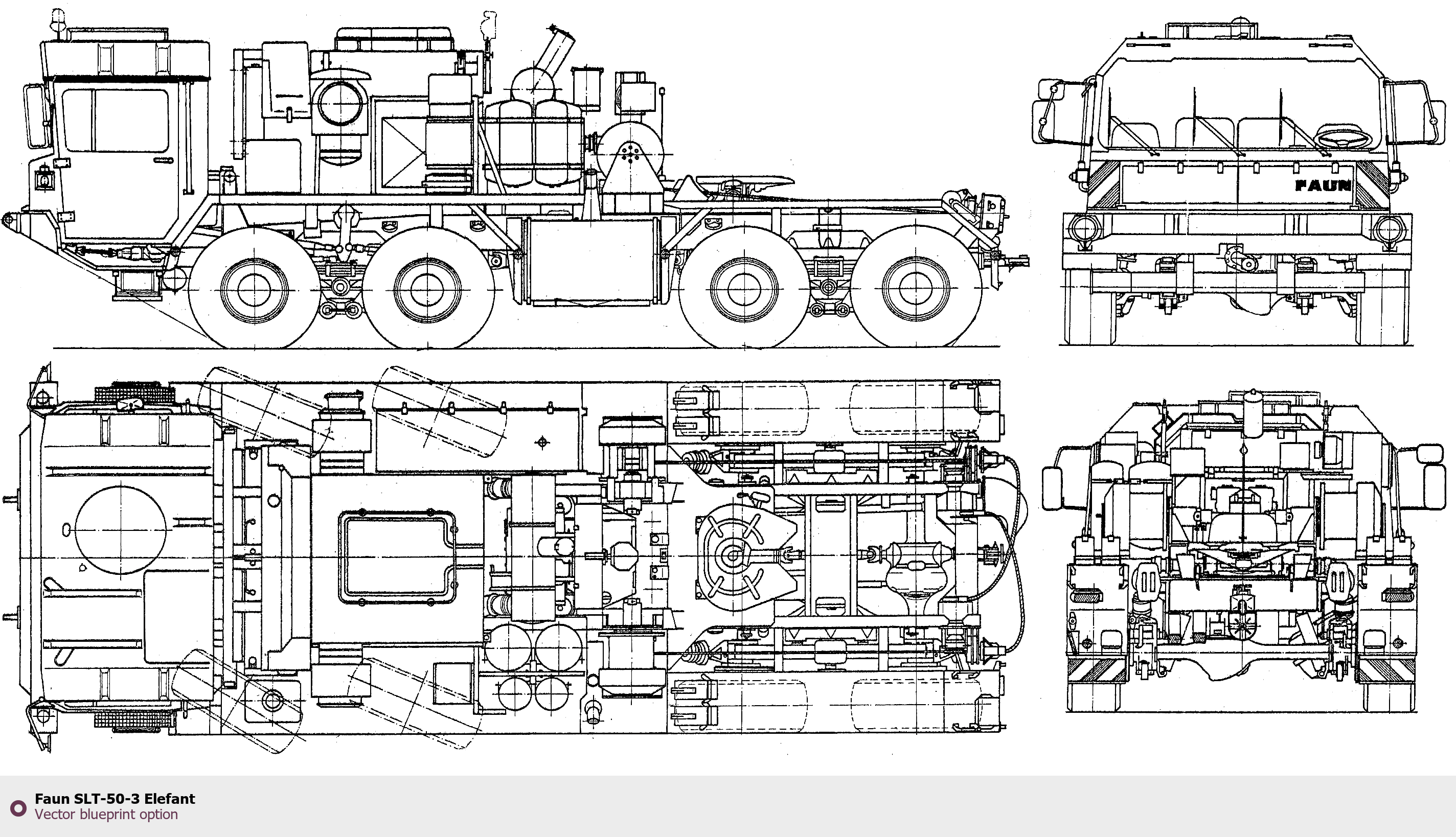 Raster blueprint of the Faun SLT-50-3 Elefant Heavy Truck. This free downloadable image can be used for graphic projects, digital design, and 3D modeling. The file provides accurate exterior proportions of the vehicle. Body type: Heavy Truck.