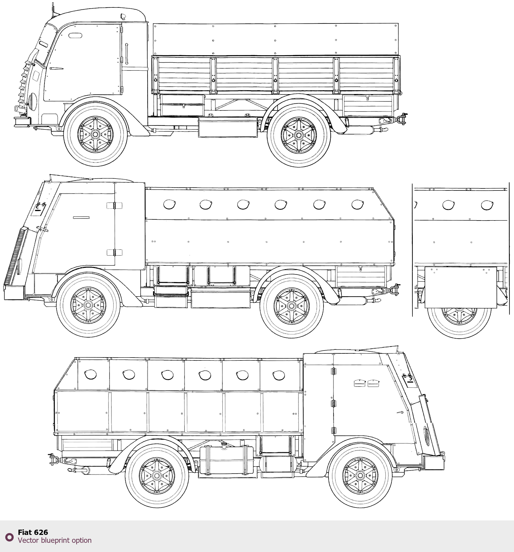 Raster blueprint of the Fiat 626 Heavy Truck. This free downloadable image can be used for graphic projects, digital design, and 3D modeling. The file provides accurate exterior proportions of the vehicle. Body type: Heavy Truck.