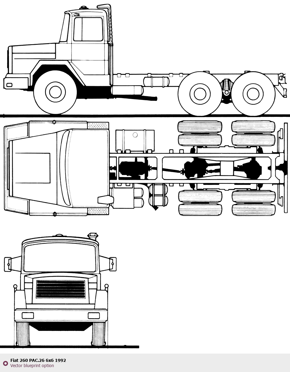 Raster blueprint of the 1992 Fiat 260 PAC.26 6x6 Heavy Truck. This free downloadable image can be used for graphic projects, digital design, and 3D modeling. The file provides accurate exterior proportions of the vehicle. Model year: 1992. Body type: Heavy Truck.