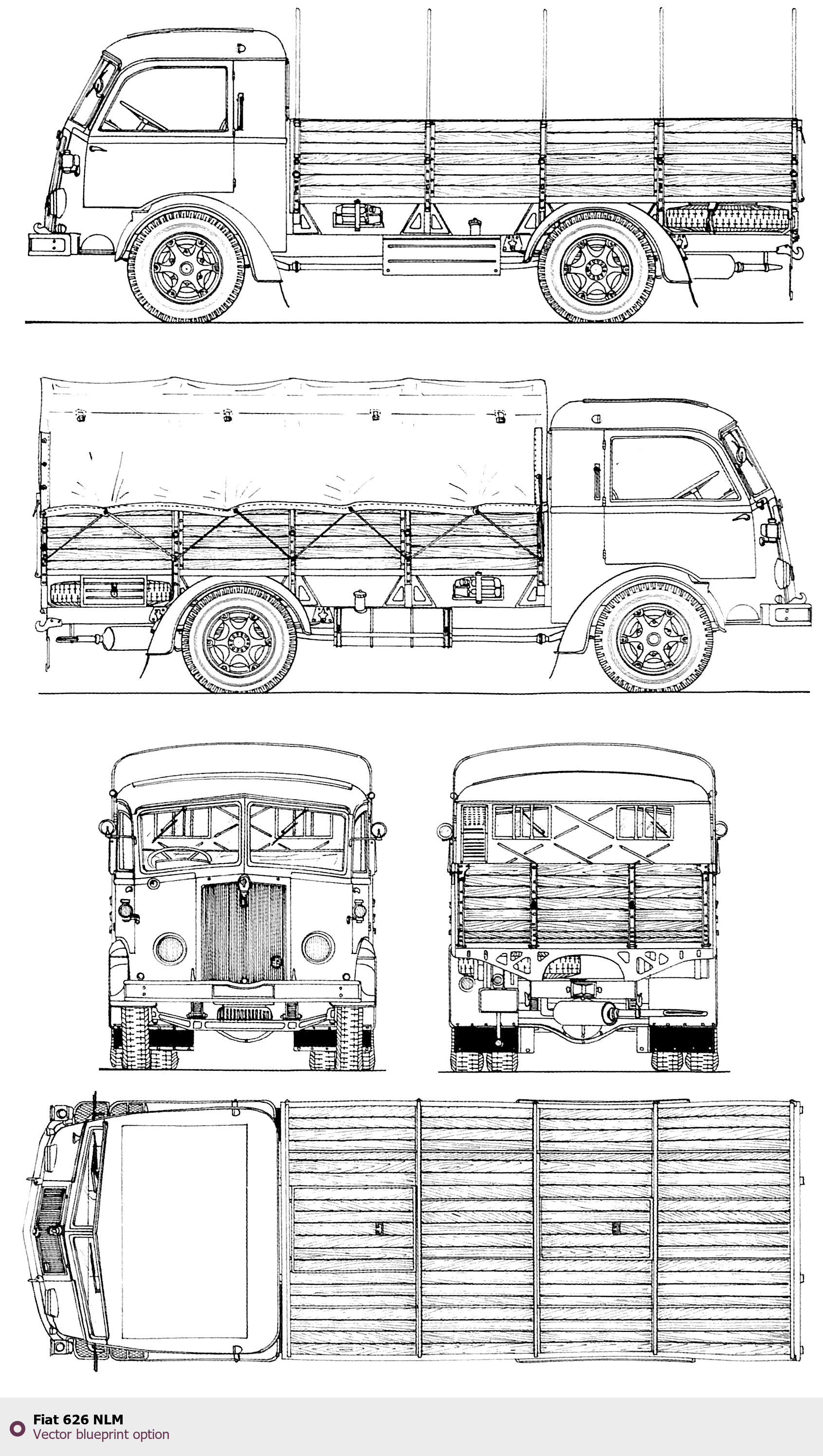 Raster blueprint of the Fiat 626 NLM Heavy Truck. This free downloadable image can be used for graphic projects, digital design, and 3D modeling. The file provides accurate exterior proportions of the vehicle. Body type: Heavy Truck.