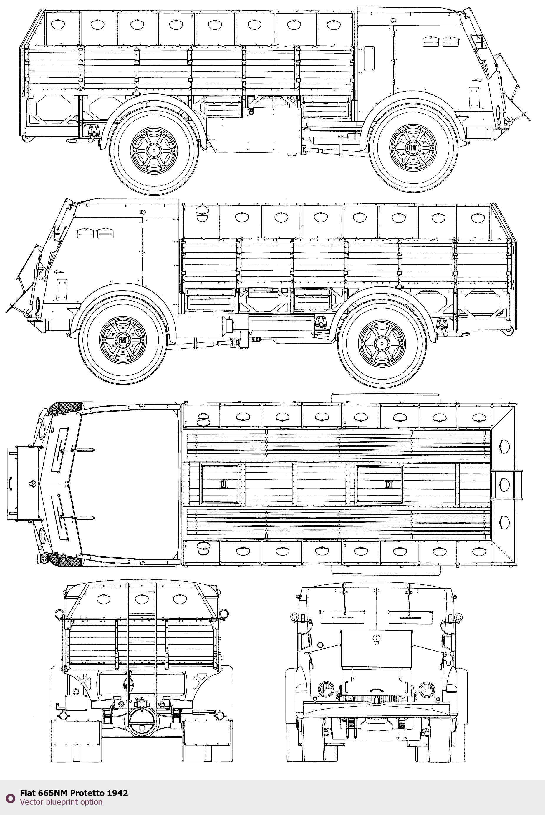 Raster blueprint of the 1942 Fiat 665NM Protetto Heavy Truck. This free downloadable image can be used for graphic projects, digital design, and 3D modeling. The file provides accurate exterior proportions of the vehicle. Model year: 1942. Body type: Heavy Truck.