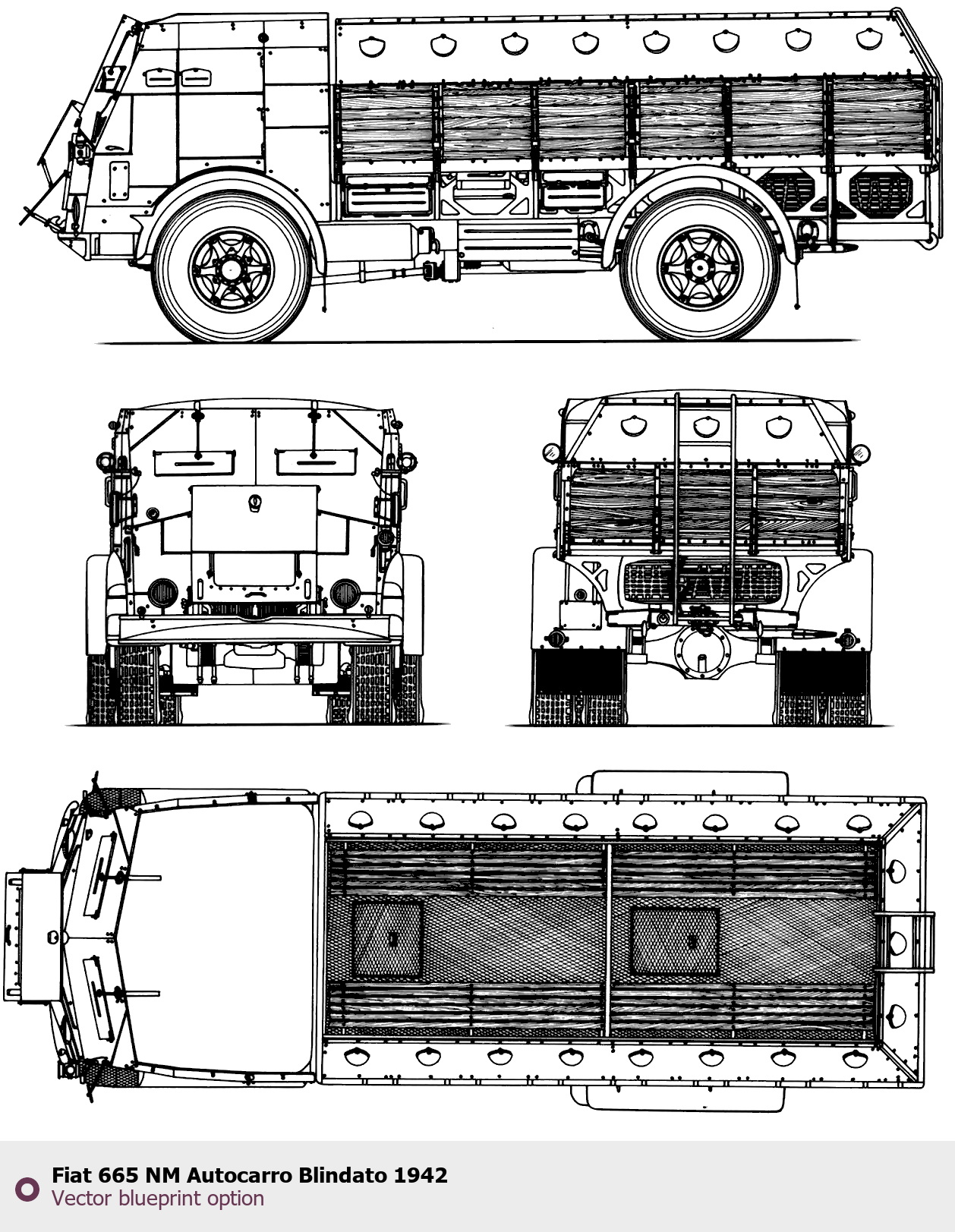 Raster blueprint of the Fiat 665 NM Autocarro Blindato 1942 Heavy Truck. This free downloadable image can be used for graphic projects, digital design, and 3D modeling. The file provides accurate exterior proportions of the vehicle. Body type: Heavy Truck.
