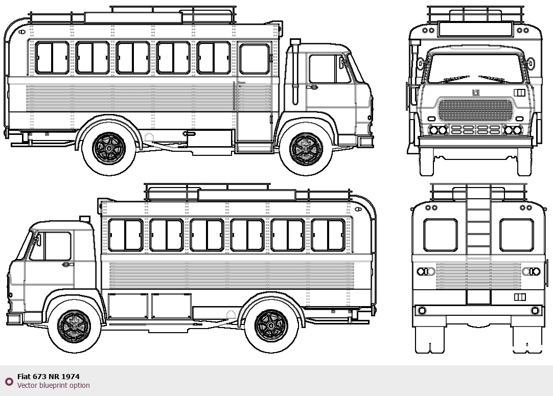 Raster blueprint of the 1974 Fiat 673 NR Bus. This free downloadable image can be used for graphic projects, digital design, and 3D modeling. The file provides accurate exterior proportions of the vehicle. Model year: 1974. Body type: Bus.