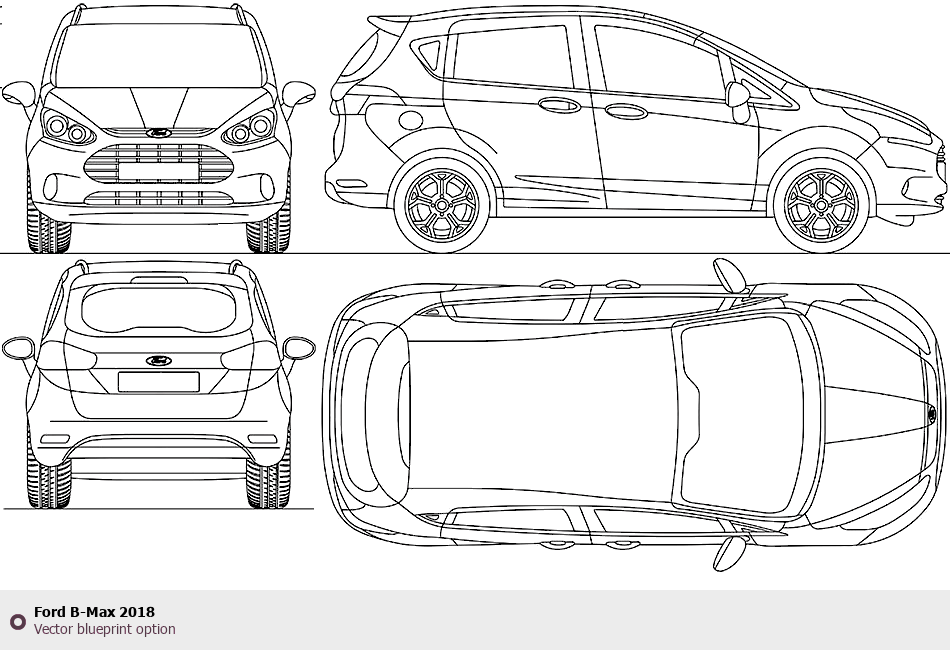 Raster blueprint of the 2018 Ford B-Max Minivan. This free downloadable image can be used for graphic projects, digital design, and 3D modeling. The file provides accurate exterior proportions of the vehicle. Model year: 2018. Body type: Minivan.
