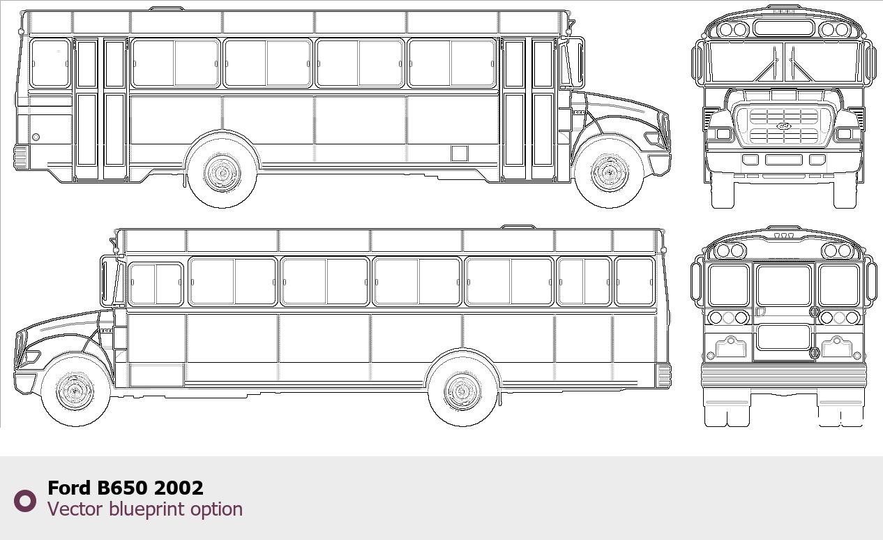 Raster blueprint of the 2002 Ford B650 Bus. This free downloadable image can be used for graphic projects, digital design, and 3D modeling. The file provides accurate exterior proportions of the vehicle. Model year: 2002. Body type: Bus.