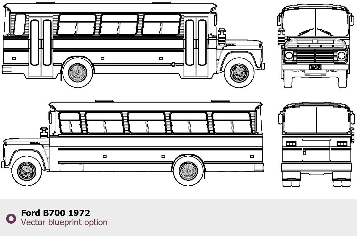 Raster blueprint of the 1972 Ford B700 Bus. This free downloadable image can be used for graphic projects, digital design, and 3D modeling. The file provides accurate exterior proportions of the vehicle. Model year: 1972. Body type: Bus.