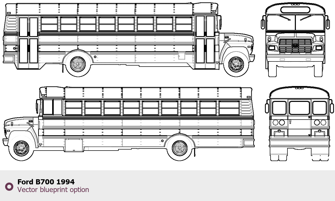 Raster blueprint of the 1994 Ford B700 Bus. This free downloadable image can be used for graphic projects, digital design, and 3D modeling. The file provides accurate exterior proportions of the vehicle. Model year: 1994. Body type: Bus.