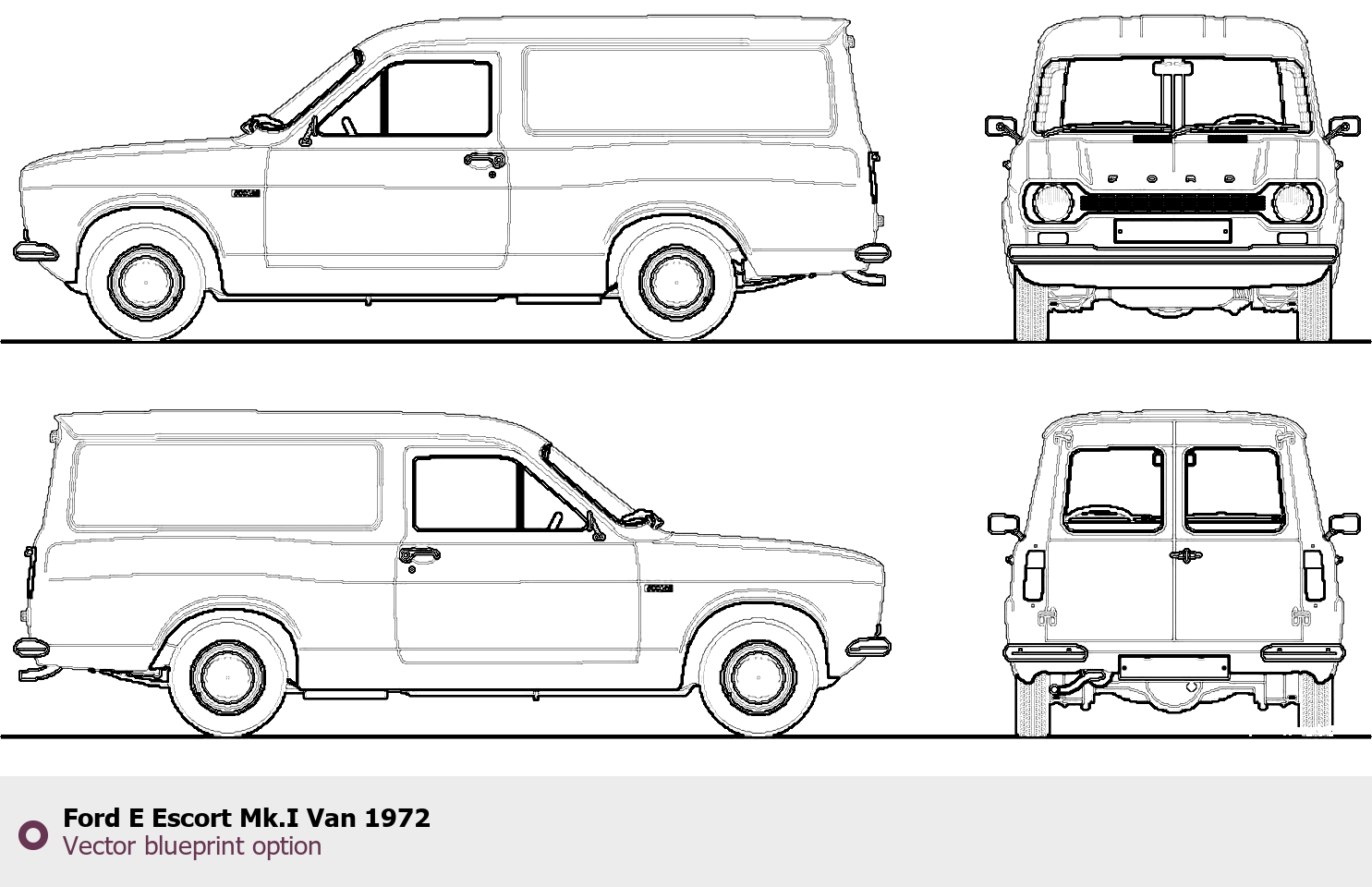 Raster blueprint of the 1972 Ford E Escort Mk.I Van Van. This free downloadable image can be used for graphic projects, digital design, and 3D modeling. The file provides accurate exterior proportions of the vehicle. Model year: 1972. Body type: Van.