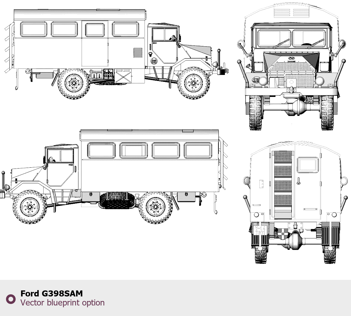 Raster blueprint of the Ford G398SAM Heavy Truck. This free downloadable image can be used for graphic projects, digital design, and 3D modeling. The file provides accurate exterior proportions of the vehicle. Body type: Heavy Truck.