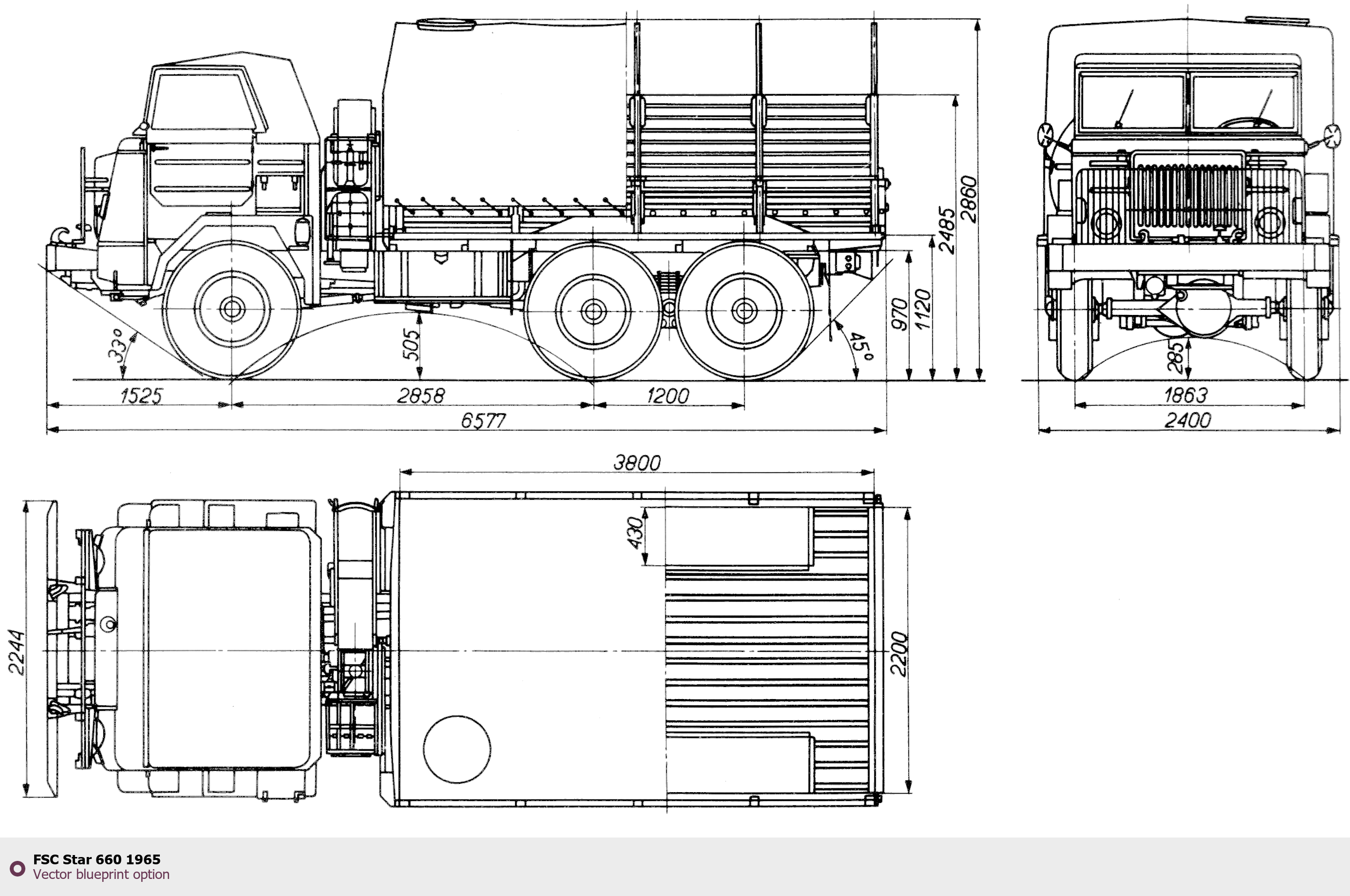 Raster blueprint of the 1965 FSC Star 660 Heavy Truck. This free downloadable image can be used for graphic projects, digital design, and 3D modeling. The file provides accurate exterior proportions of the vehicle. Model year: 1965. Body type: Heavy Truck.