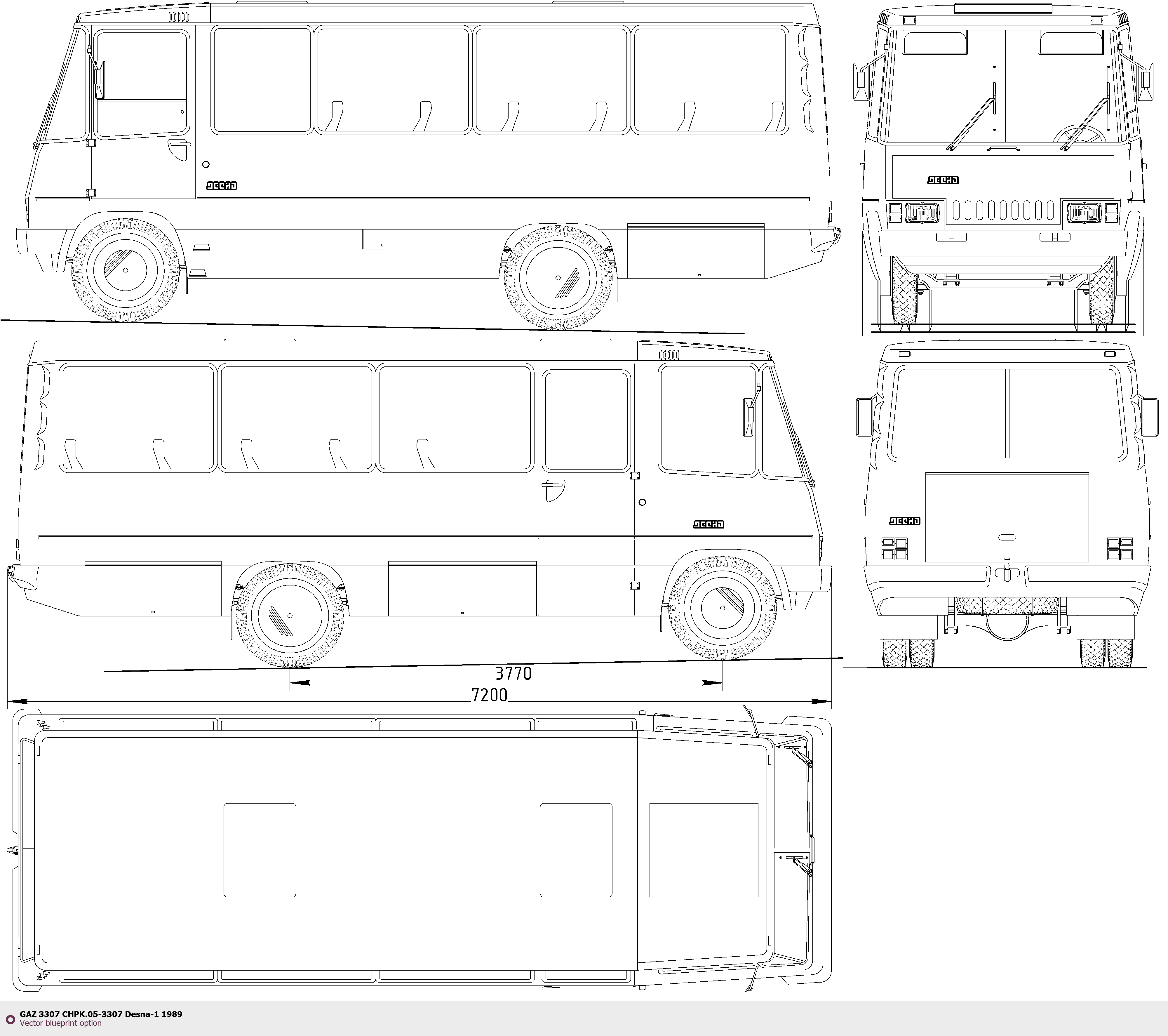 Raster blueprint of the 1989 GAZ 3307 CHPK.05-3307 Desna-1 Bus. This free downloadable image can be used for graphic projects, digital design, and 3D modeling. The file provides accurate exterior proportions of the vehicle. Model year: 1989. Body type: Bus.